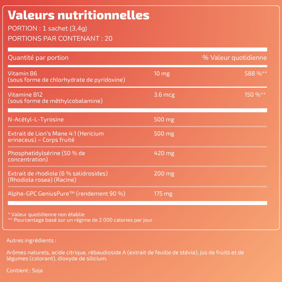 N-Acetyl-L-Tyrosine keeps your stress response balanced. You stay calm, focused, and clear-headed—even when things get intense. The gentle caffeine (75 mg) energizes without jitters.